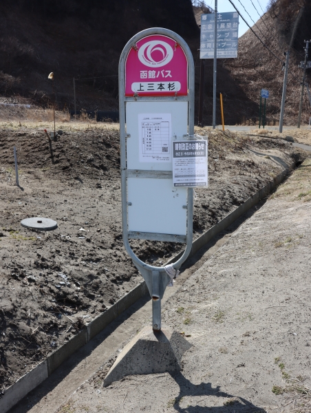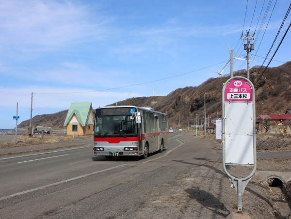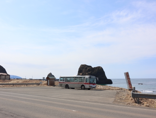 国道229号追分ソーランライン上に位置しています。周辺には民家も少なく一応は三本杉岩の観光のためここまで来ているような感じ。この先須築方面まで路線がありましたが函館バスから瀬棚町営バスを経て現在はデマンドバスとなっています。直接折返す便はないようで北桧山との間を回送します。