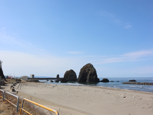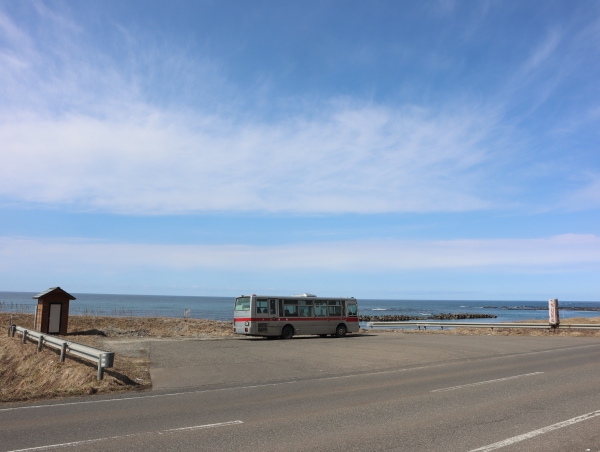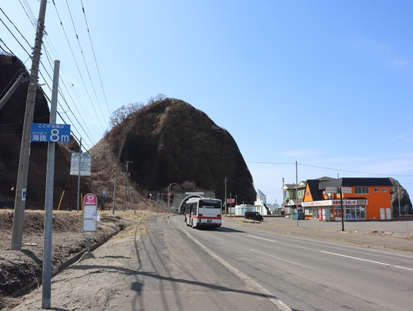 せたな町の中心部瀬棚を過ぎたバスは景勝地でもある三本杉岩を左手に短い三杉トンネルを抜けるとすぐで、周辺には海水浴場の駐車場やドライブインなどがあります。