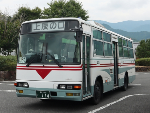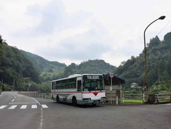 2018年7月の豪雨で経由する県道29号線が地すべりのため長期通行止めとなり、迂回運行が続いていた上辰の口線。以前の訪問時に乗車できず再訪。その場で路線廃止の予定を知るという...。荷刺から肱川沿いに走ります。このルートは国鉄バス由来で宇和島バス本来のルートは川向いのよう。鎌田を過ぎ民家もない地帯をしばらく栗の木まで。この間で地滑りしたよう。ダム湖畔を坂石、河成と進み、終点の上辰の口へ。帰りのバスには上辰の口から1人の乗車がありました。[2025/08]