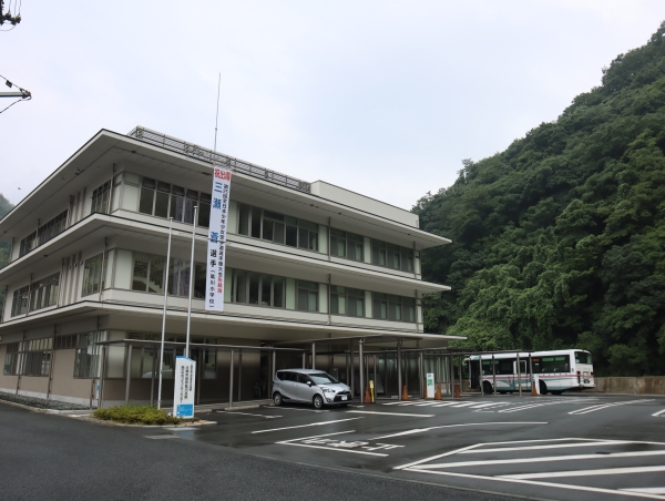 河辺方面に続く鹿野川バイパスから左折し、河辺川を渡ると鹿野川の中心、鹿野川です。バスはそこから少し進み、川沿いの路地へと左折します。真新しい大洲市肱川地区複合公共施設の建物があります。バスはその駐車場内に入り、頭を建物側に向けて停車しました。