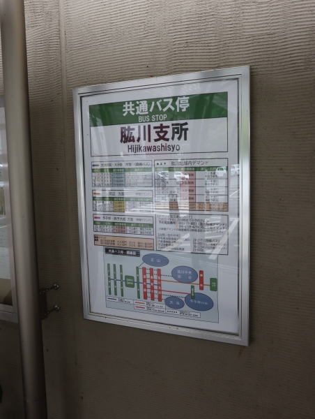 バス停ポールはなく、施設の壁にポスターのように時刻表が貼られています。この奥も多くの路線がありましたが廃止され、デマンドタクシーに切り替わっています。肱川支所はその乗り継ぎ点としての役割もあります。