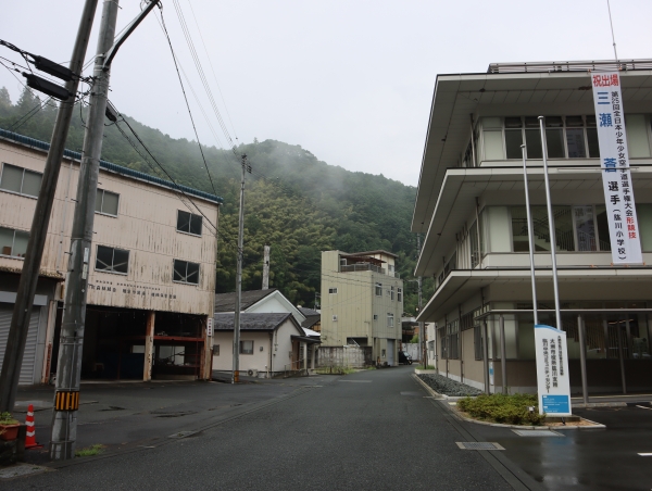河辺川沿いの狭い平地に集落が形成されており、鹿野川からはその集落を小さく回るような路線となっています。右写真の方向に歩いて行っても鹿野川バス停付近に出ます