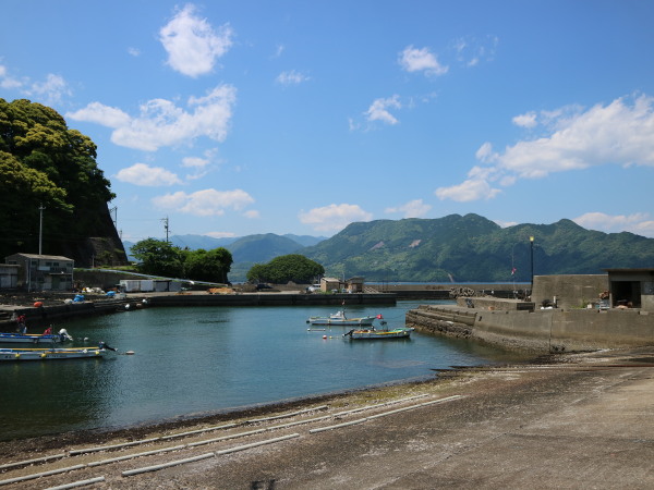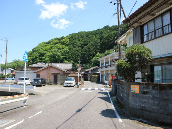 終点から九鬼方向。周辺は行野浦の集落が広がります。小さな湾に向かって家々が並びます。