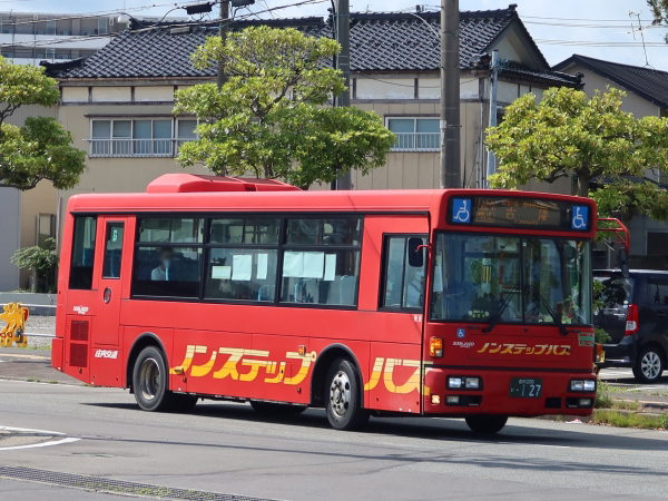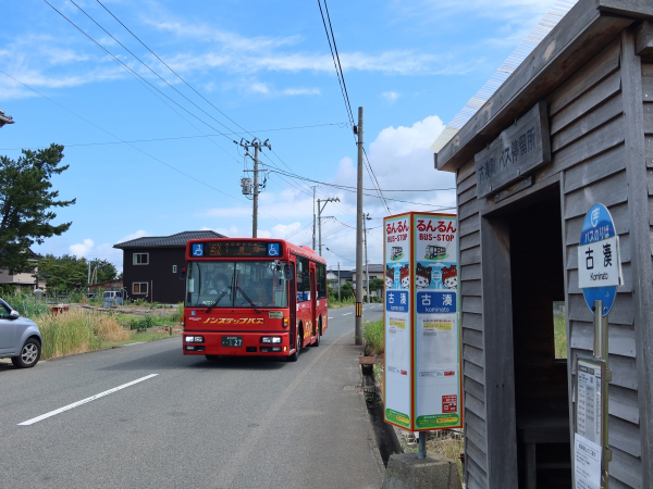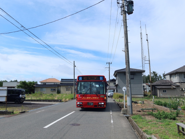 到着したバスは近傍の酒田営業所へ回送していきます。酒田市街地を縦断する庄内交通の古湊〜十里塚・八重浜線のほか、酒田市営るんるんバスの古湊アイアイひらた線がやってきますがそちらは月水金曜日の運行です。