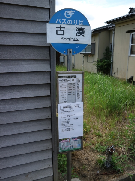 近年取り替えたと思われるものですが、どこかの廃品なのか、バス停名はラミネートされた紙が貼られるだけです。平日は1〜3時間に1本ほど、土日祝日は4往復の運行です。