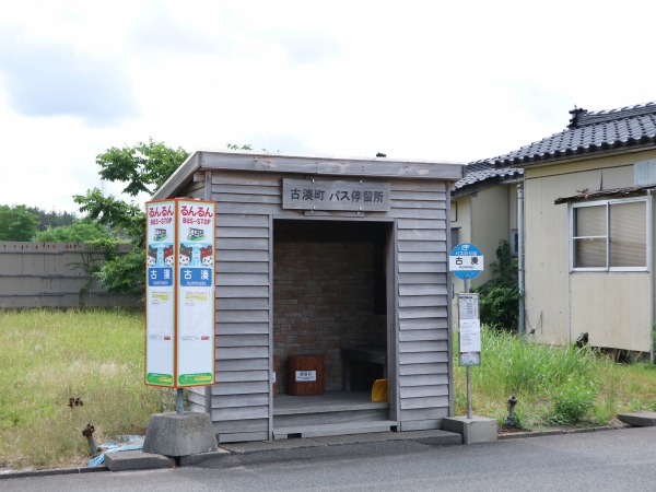 ログハウス風の待合所が置かれています。「古湊町バス停留所」となっています。るんるんバスのポールのほうが豪華です。