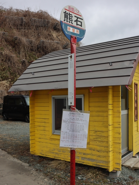 江差方には背の高いポールが設置されていました。すべての便が熊石で折返し運行となるダイヤで平日6往復、日祝日5往復の運行です。