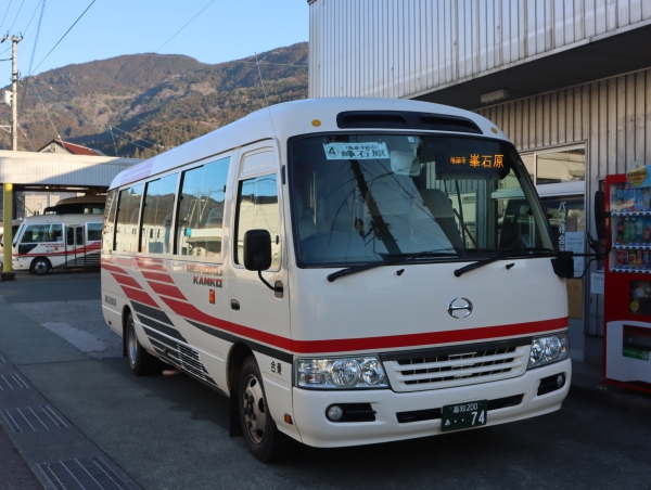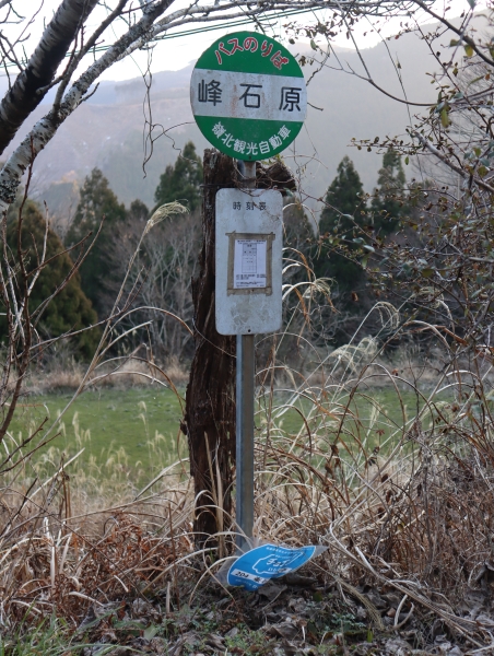 嶺北観光の標準的なもの。県交通などの古いポールが目立ちますがここは新しいものでした。朝と晩に1往復ずつで、朝の便は平石経由です。バス停名は「峰石原」ですが「峯石原」も混用されています。