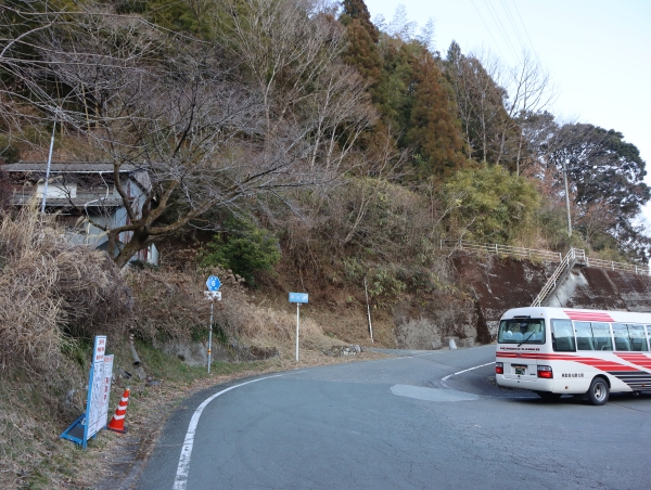 大半の便が折り返す西石原から狭隘な坂を登りたどり着くのが終点の峰石原です。坂を上り詰めた先、県道との丁字路にバス停があり、到着したバスは丁字路で方向を変えると田井行きとして折り返していきます。