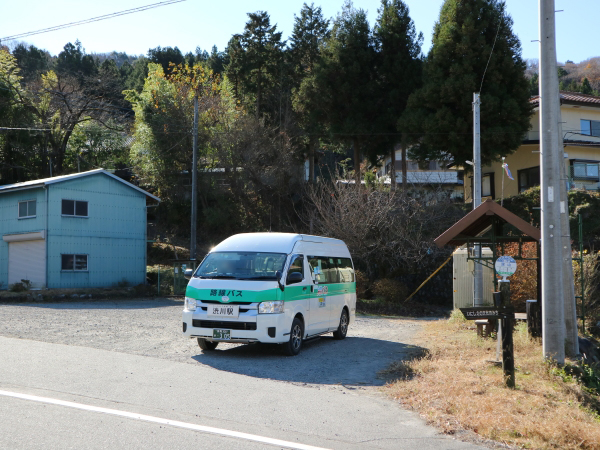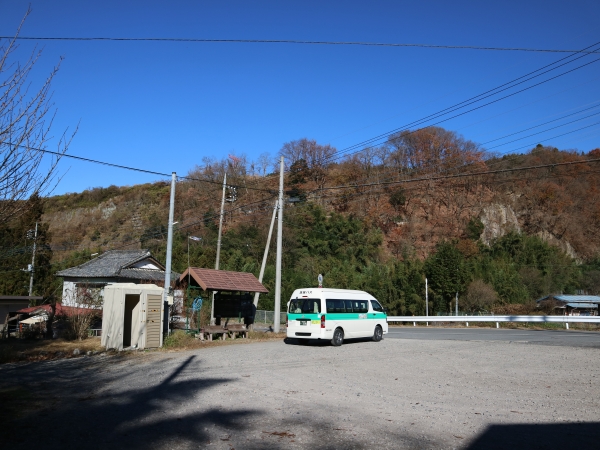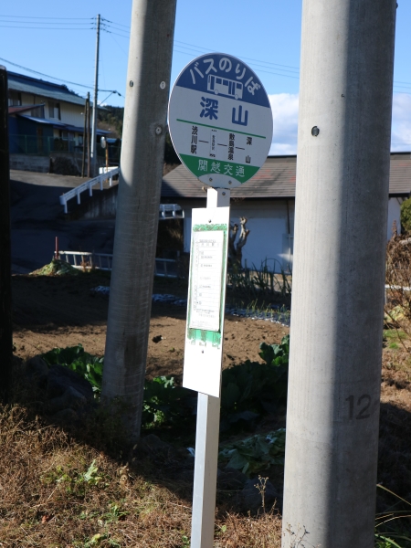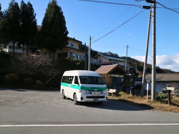 県道157号線沿いにバス停があります。周辺は狭い県道が続いていますが、ハイエースなので問題なく。県道はこの先で左に折れます。深山の集落の上手に位置しています。