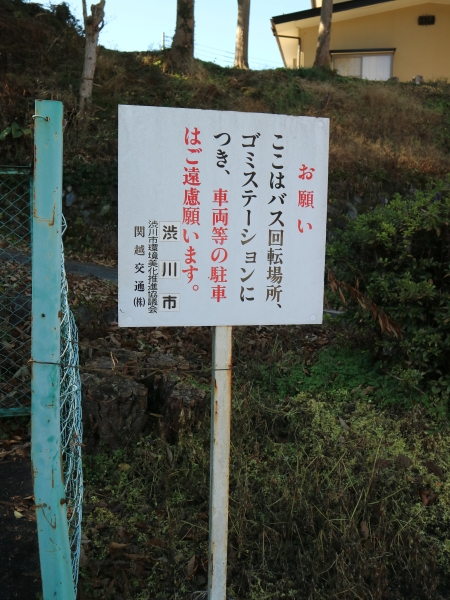 ポールは関越交通の標準的なもの。深山線は平日は7往復、土曜日は5往復の運行です。日曜祝日には全便運休となります。折返場所の看板は赤城町時代からのもので、ゴミステーションであるため駐車禁止という内容も併記されています。ゴミステーションの前に立っています。