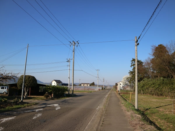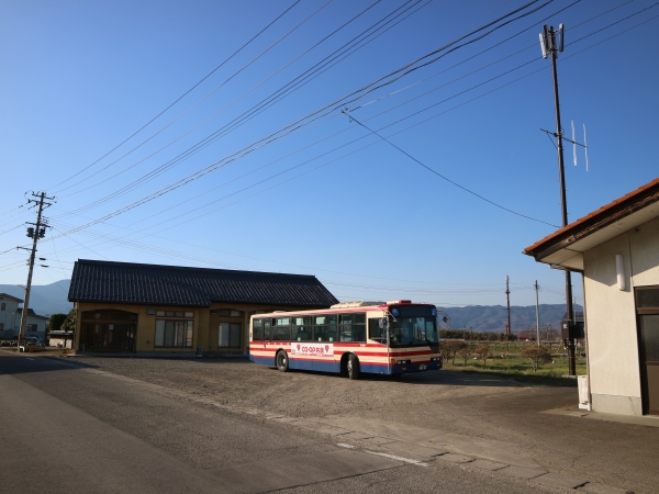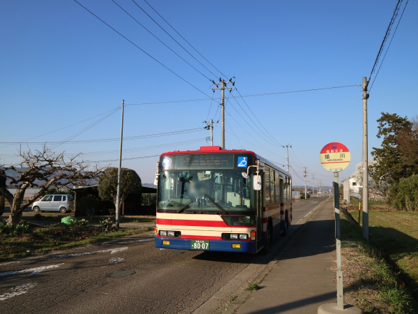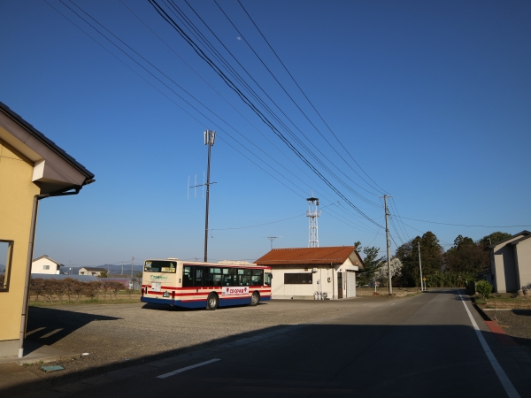 田畑が広がり、家々が散在する中にバス停があります。この先にも路線が続きそうな雰囲気さえありますがバスはここまでです。すぐ先の丁字路を回送バスは左折していきます。