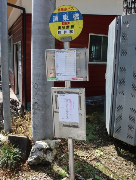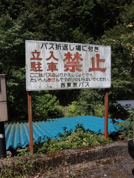 新しいタイプのダルマポールとなっていました。以前は桜木行きもありましたが、川井駅行きに短縮され修正されていました。(桜木→清東橋は残っています。)折返場所の看板は古びており、ひらがなも併記されています。※2025年10月現在は土日祝日の川井循環を除き全便奥多摩駅発着です。