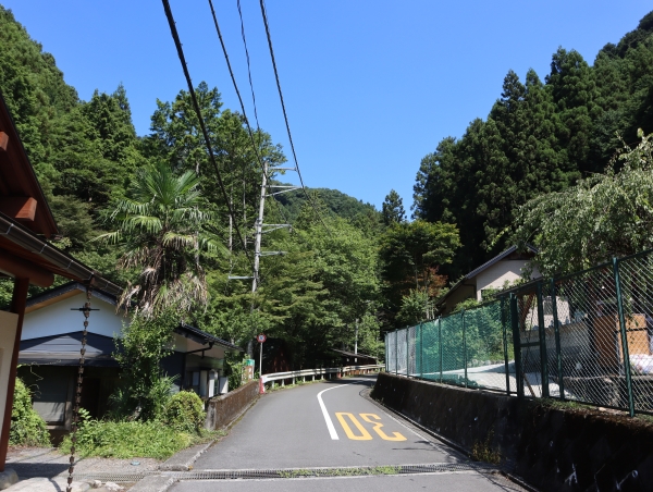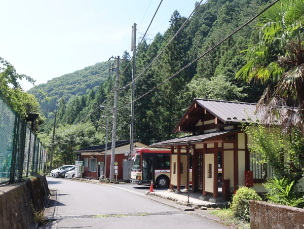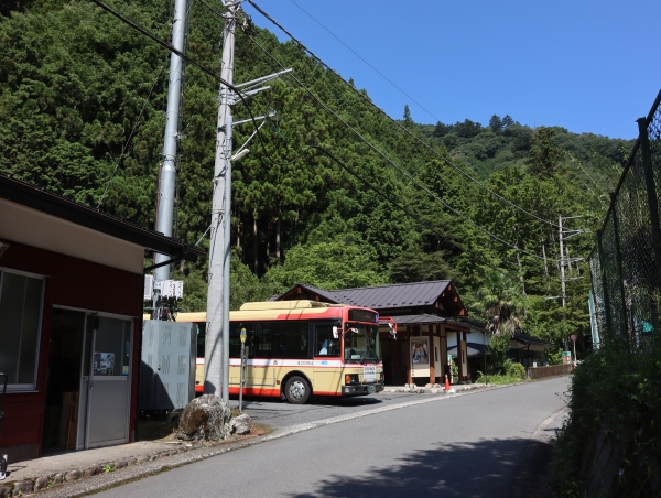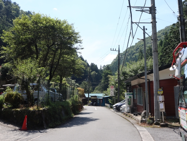 山間の静かな集落ですが、行楽客の姿も。周辺には自然の豊かさを利用したキャンプ場がいくつかあり、バス停向かいにも清東園キャンプ場があります。この先道は行き止まりとなっていることもあってか、交通量はありません。