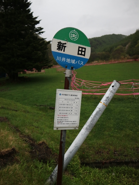 川井地域バスのポールです。毎日運行ですが本数は少なく3本と最終便の大仁田経由新田行きが平日のみ運行されます。