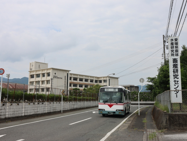 県道29号から分岐して阿下方面に向かう市道上にバス停があります。民家はなく、停留所名の由来である愛媛県農林水産研究所畜産研究センターや野村高校があります。