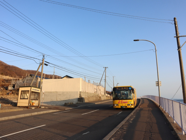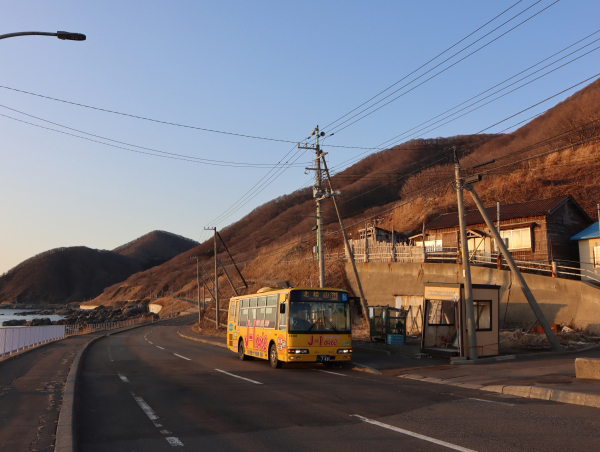 海岸と集落の間に伸びる道道上にバス停があります。到着したバスは少し先の折返場所へと進んでいきます。
