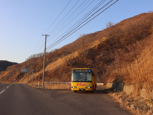 折返し北桧山行きがバス停に到着。山側にわずかながら家々が並びます。
